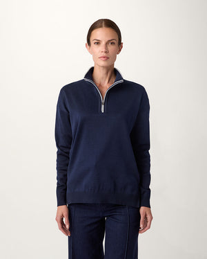 Soft yet durable, this Giza cotton quarter-zip pullover offers smooth, structured comfort. With our signature knit technology it is naturally breathable and moisture-wicking, designed for movement with side vents for enhanced performance and flexibility. Detailed with a high-neck ribbed collar engineered to retain its natural drape and structure, drop-shoulders, and subtle color accents for a refined touch.