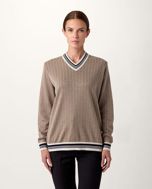 Luxury and performance combine in this effortlessly soft Merino wool v-neck sweater inspired by timeless collegiate sportswear. Durable yet soft, it offers natural breathability and comfort with easy movement. Detailed with a fine pinstripe texture and color contrasting accents for a tailored look and feel.