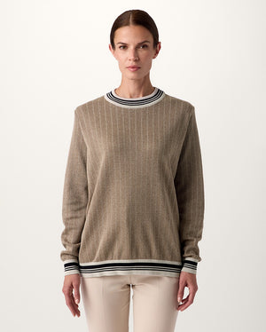 This luxuriously soft Merino wool crewneck sweater elevates vintage athletic style to a modern lens. Naturally breathable, it’s engineered for ease of movement and long-lasting wear. Crafted with a subtle pinstripe texture and color-contrast accents for a tailored design that nods to classic sportswear.